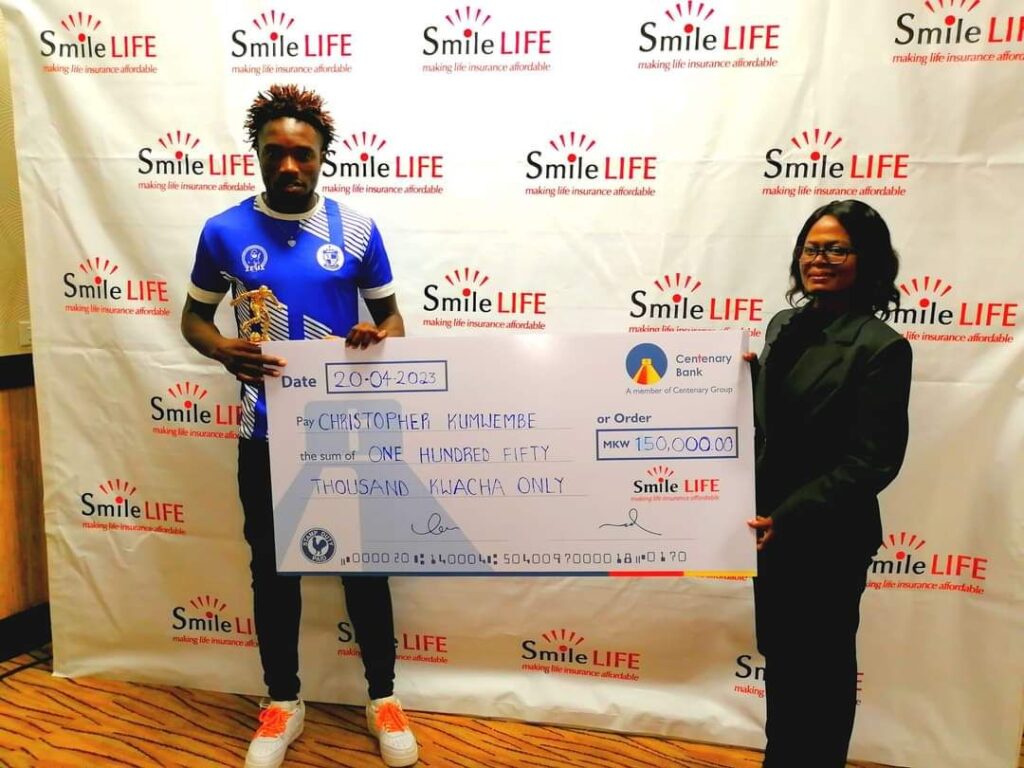 Mighty Mukuru Wanderers forward Christopher Kumwembe is the first player to receive K150, 000 from Smile Life Insurance Company Limited.